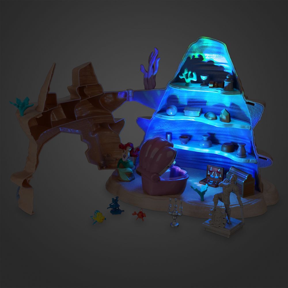Includes: the grotto, Ariel figure, seashell, Flounder, Sebastian, dancing music box, candelabra with silverware, thingamabob case, treasure chest, and a statue of Prince Eric
