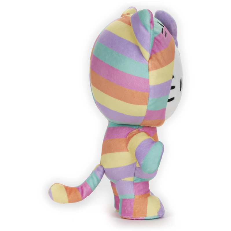 Hello Kitty loves to dress up in adorable outfits like this striped, pastel rainbow onesie pulled over her head with matching purple bow!